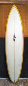 This is the most progressive fish design on the water. Notice the nice, curved outline – no wide tail, no parallel rails. This outline allows for super tight turning, yet still has that skating, fish feel. The bottom has all my signature features: chined rails with full concave to slight ‘V’ in the tail for a loose and fast ride. By drawing in the tail more than most fish designs, it allows the board to snap turn much easier. The full nose adds buoyancy for mushy days and a little extra nose kick prevents pearling on late, critical take-offs. If you like to fish, this is the board for you! As always, I can make this board in any size, for any surfer.